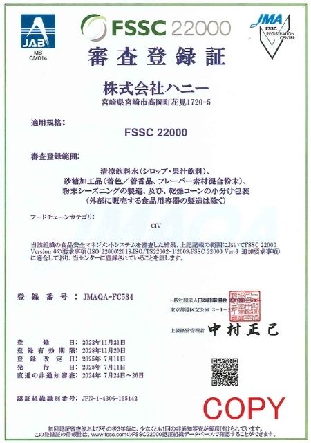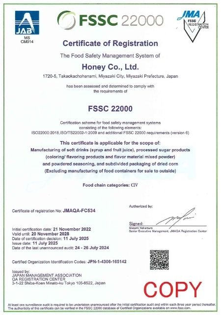 本認証は、清涼飲料水(シロップ・果汁飲料)、砂糖加工品(着色/着香品、フレーバー素材混合粉末)、粉末シーズニングの製造、及び乾燥コーンの小分け包装(外部に販売する食品容器の製造は除く)に関する食品安全管理体制が、国際的な基準に適合していることを第三者機関により認められたものです。